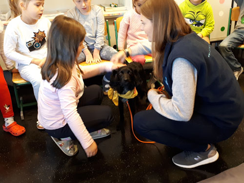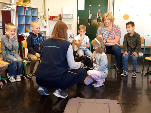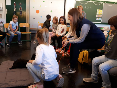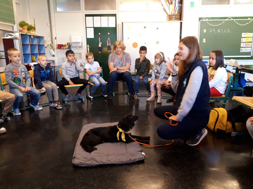 Frau Strohmeier und ihr Therapiehund besuchen die ersten Klassen.